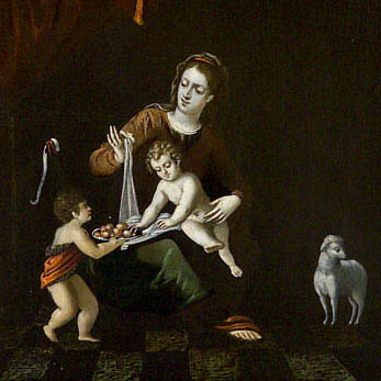 Influencé par la pensée salésienne, Jacques Stella accorde une attention particulière à l’iconographie de la Vierge à l’Enfant dans un intérieur, symbole par excellence de l’amour de Dieu. Cette idée permet de mieux appréhender la partie religieuse de son œuvre dans laquelle règnent les principales valeurs de ce courant : paix, amour, grâce, don et simplicité. Mariette voit dans la gravure de l’œuvre « La Ste Vierge en demie figure recevant les caresses de son divin fils qu’elle porte entre ses bras ». Afin de rendre visible l’humanité du Christ, le peintre complète ses compositions par la présence d’éléments domestiques d’intérieurs, ici une table nappée d’un épais velours rouge, et abandonne par ailleurs les éléments classiques du répertoire christique telles que les auréoles. La présence divine aimante est suggérée à travers l’épais rideau rouge présent dans la partie gauche.