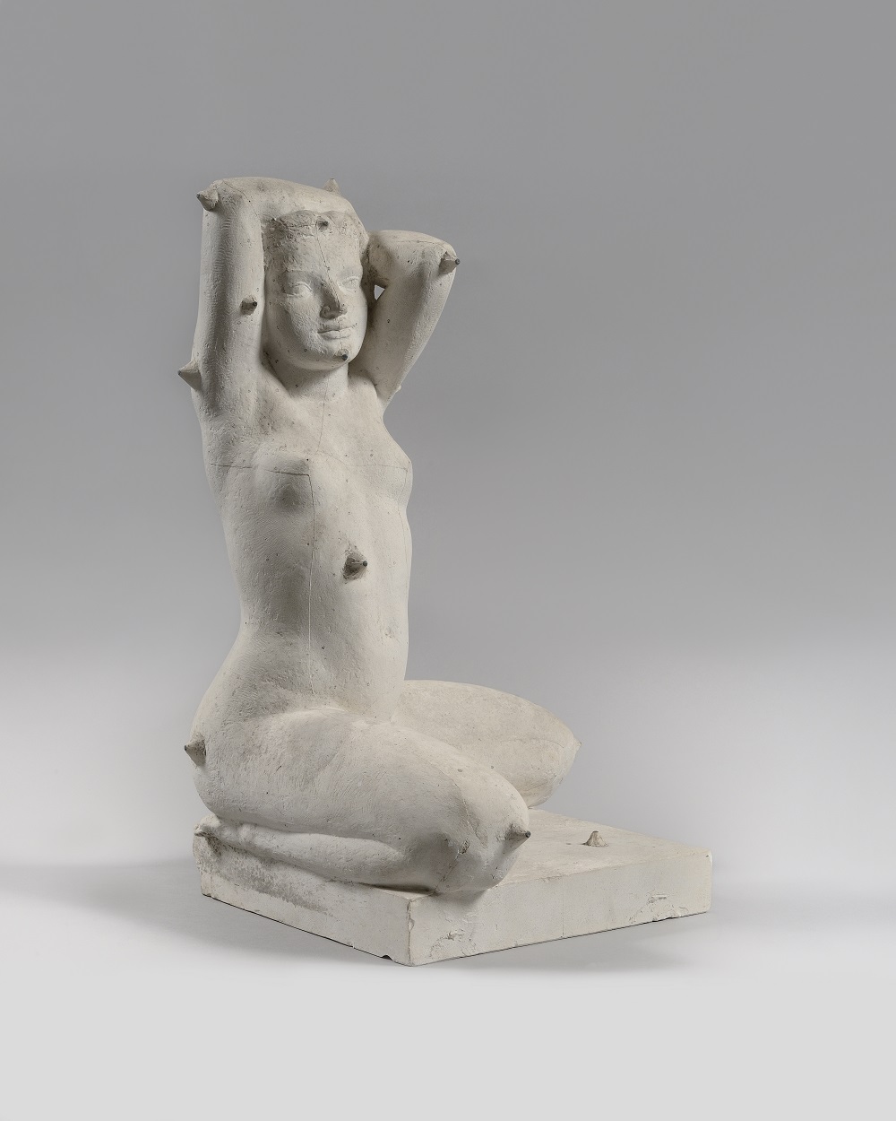 Athlétique et sereine, mais en même temps sensuelle, la jeune femme au sourire d’une korè grecque incarne merveilleusement cette poétique architecturée de Bouret. La surface rugueuse du plâtre rappelle déjà la pierre, elle capte et absorbe la lumière, rendant la figure quasi minérale.