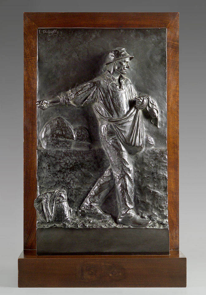 Or notre semeur, bas-relief de bronze marqué du sceau de l’excellence en matière de fonte (fonderie Barbedienne), est une version réduite du monument aux morts en hommage à Jean-Jaurès commandé à Desruelles par la ville de Dole. Desruelles décide de le représenter en semeur, faisant ainsi écho à la célèbre médaille de bronze de Roty datant de 1887 où la légendaire Marianne coiffée d’un bonnet phrygien sème généreusement ses idées républicaines aux quatre vents, et qui fut reproduite par la suite sur nombre de pièces de monnaies et timbres français. Ainsi, Jean Jaurès, pacifiste convaincu, mort assassiné en 1914 pour s’être ardemment opposé au déclenchement de la Grande Guerre, est ici représenté jetant allégoriquement à terre ses innombrables idées qui, peut être un jour, germeront et fleuriront.
