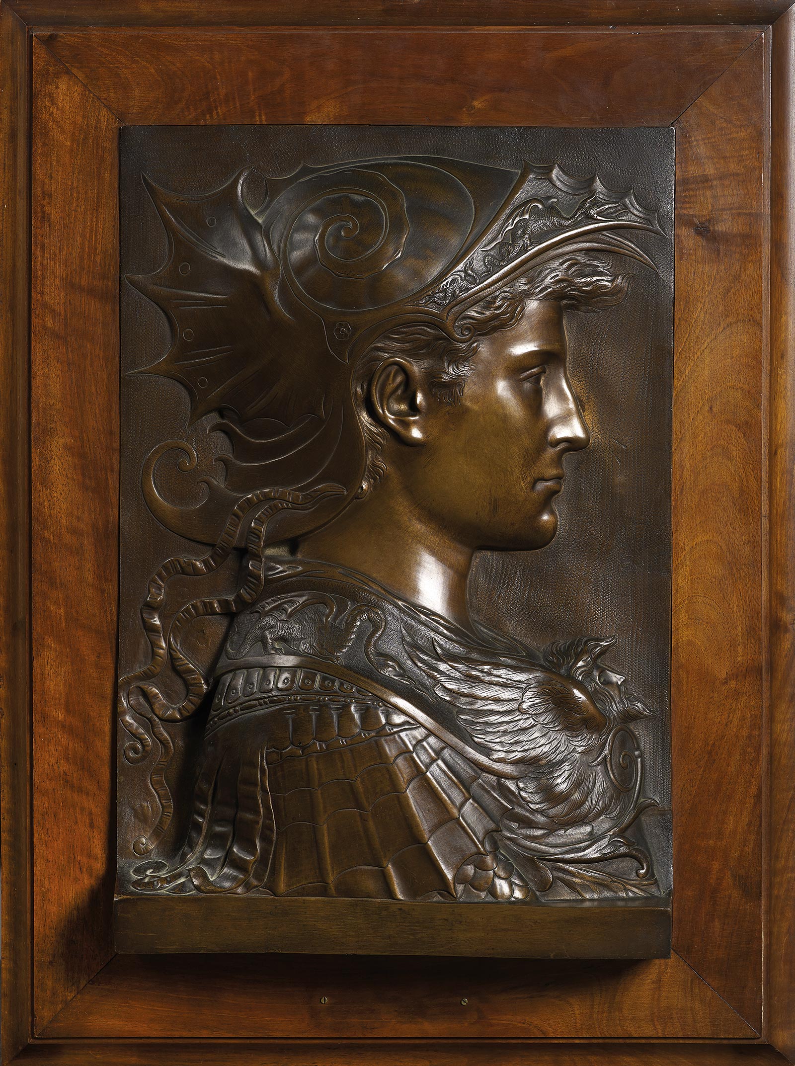 Mais à la fin du XIXe siècle, on était encore à parler de Verrocchio et de Léonard à propos de ce marbre, que le collectionneur montrait très volontiers aux chercheurs et aux artistes. C’est ainsi que ce Scipion de la Renaissance inspira l’un des sculpteurs parisiens à la création d’un buste en bronze, peut-être de Persée ou d’Alexandre le Grand. Pour autant, il ne s’agissait nullement d’une copie servile ni d’une réplique plus ou moins ressemblante, mais bien d’une réinterprétation très personnelle et chargée de sens, tout à fait dans le goût de l’école symboliste. Malheureusement, notre bronze ne porte ni signature, ni cachet, ni marque de fondeur capables d’aider à son attribution. Par ailleurs, le cartouche qui était fixé sur la traverse inférieure du cadre a disparu sans que l’on sache ce qu’il contenait. Cependant, une réplique beaucoup moins travaillée en bronze poli, passée en vente à Londres en 2003, portait, sur la base, l’inscription « E. Tassel edr. [editeur] ». Il s’agit d’une signature du fondeur parisien Étienne (?) Tassel qui travailla pour Emile Peynot, Friedrich Beer et surtout César Ceribelli, sculpteur italien né à Rome établi à Paris.