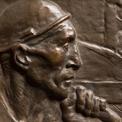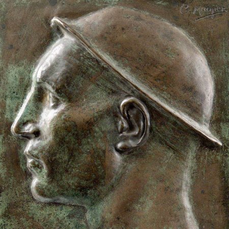 De dimensions presque identiques, les deux bas-reliefs présentent une tête d’homme de profil gauche qui semble faire corps avec la matière, tout en rendant avec une acuité étonnante les traits puissants et irréguliers des modèles. Mais ici, le bord du casque forme une diagonale mécanique et tranchante, qui contraste avec le reste modelé d’une main sûre, sans recours au ciseau. Aussi, les pupilles ne sont pas creusés et les iris ne sont pas indiqués. Le sculpteur se concentre sur la manifestation silencieuse de l’effort, il héroïse et glorifie le travail.