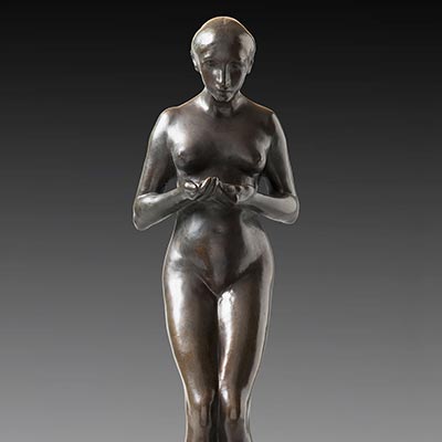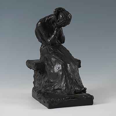 D’une remarquable qualité de fonte, notre œuvre date de la même année que l’huile sur toile intitulée Le Pays noir. Le personnage aux traits anguleux est un archétype dans l’œuvre de Meunier : on retrouve ces figures de profil, fatiguées par le labeur du Pays noir dans le bas-relief de bronze exposé au Salon de 1893, Mineurs à la sortie du puits, puis dans les plâtres et les plaques de bronze jusqu’à celle commandée en 1904 par le marchand de charbon Édouard Taymans et tirée à plusieurs exemplaires.