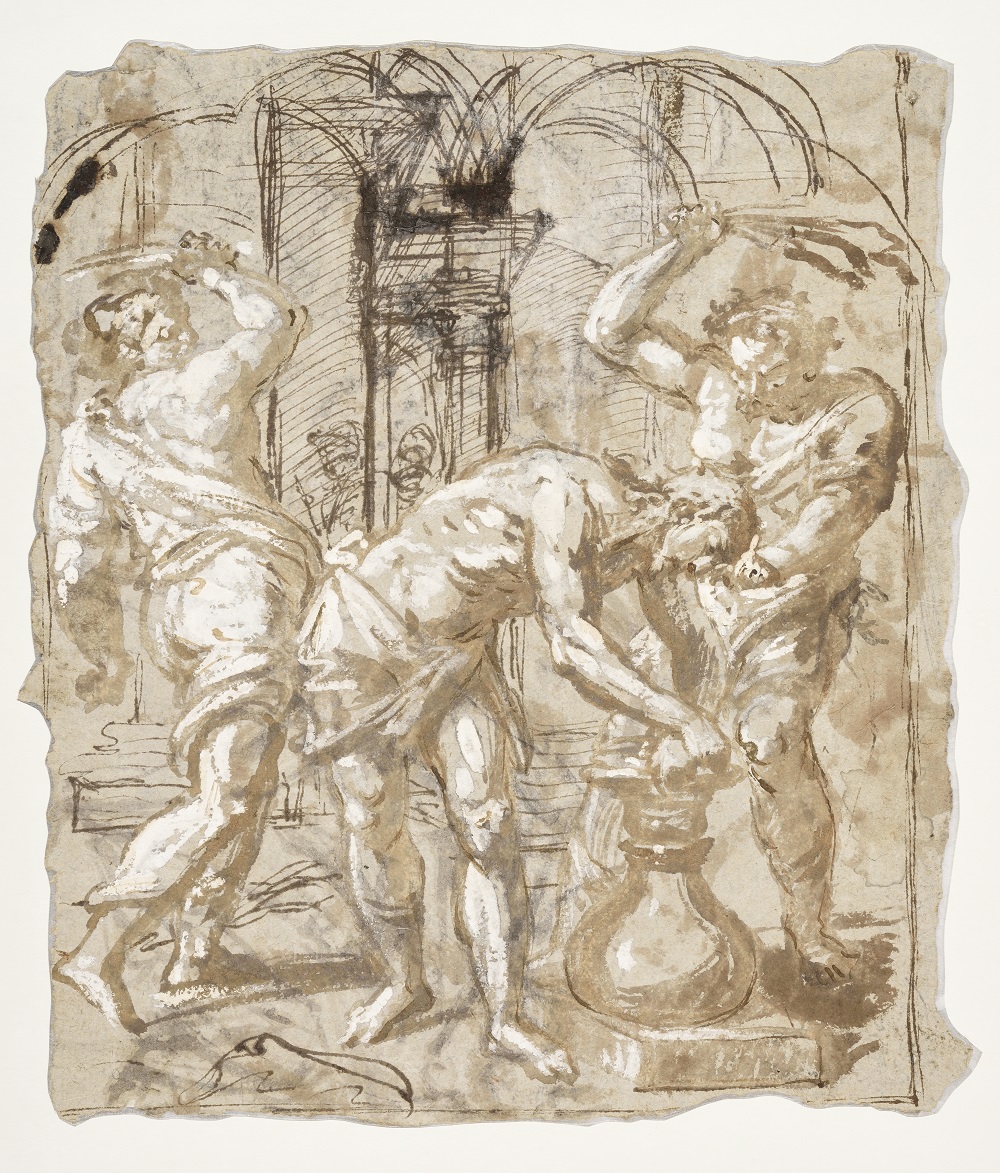 Recto : plume et encre ferro-gallique brune, lavis brun, rehauts de gouache blanche sur traits de pierre noire.