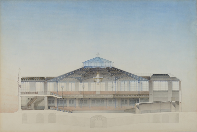 Coupe d’un projet de construction pour les contres-allées des Champs-Élysées à Paris.